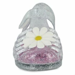Put spring in their step with these cute jelly fashion sandals. The classic transparent upper features embedded glitter for extra dazzle. A large flower on the toe adds a pop of whimsical fun that makes these shoes great for casual and formal events alike.