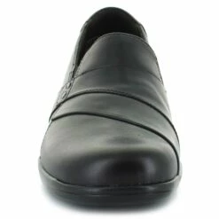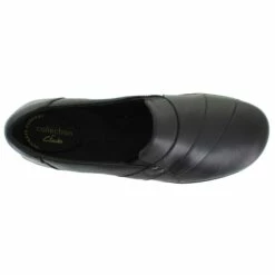 A clean, classic design with walk-all-day comfort. Made from extra-soft black leather with stretch gores, fabric/leather linings, OrthoLite footbed, TPR outsole, and sculpted low heel, this women’s shoe from the Clarks Collection defines easy wearability. Slip it day or night on to add a cute finishing touch to jeans, skirts, or pants.