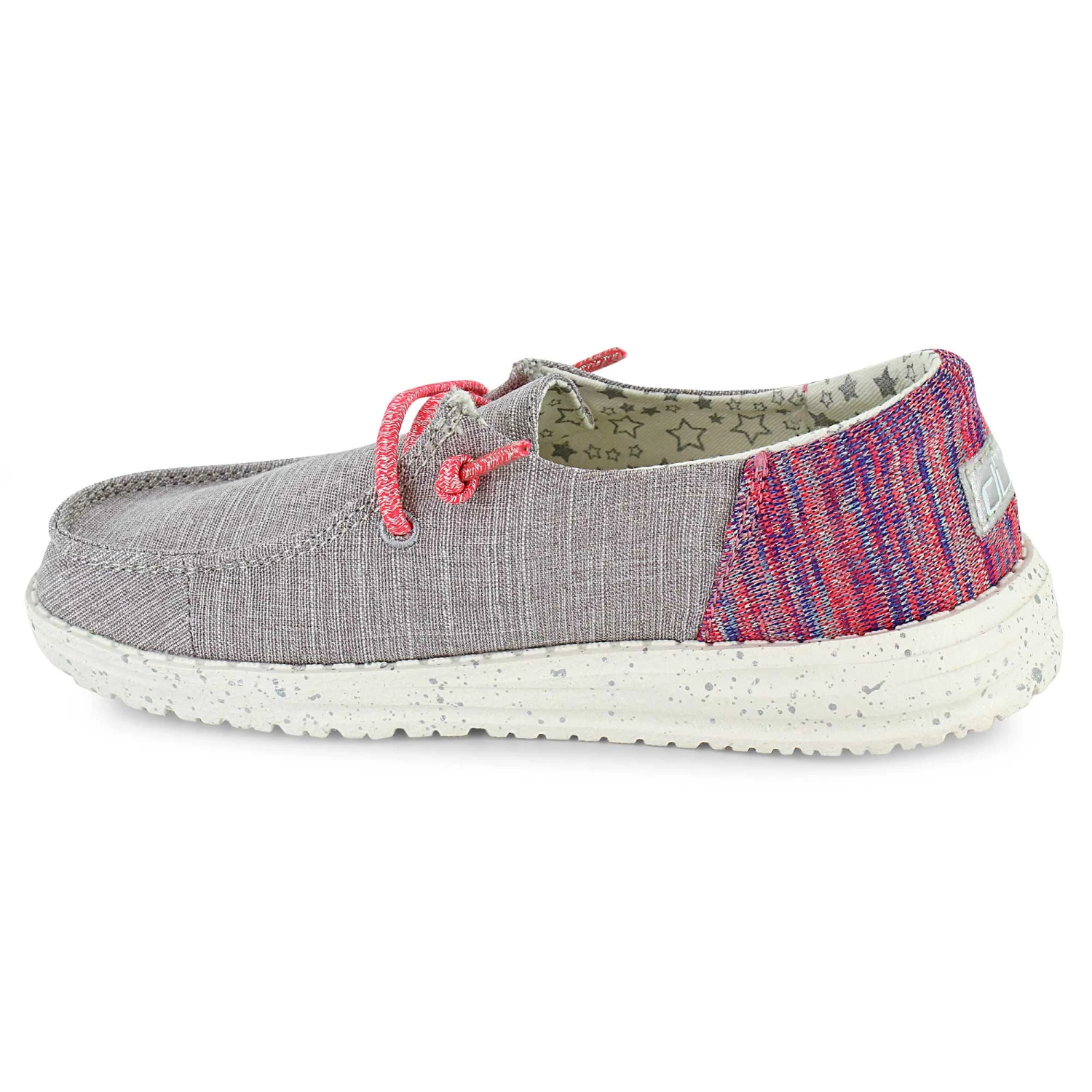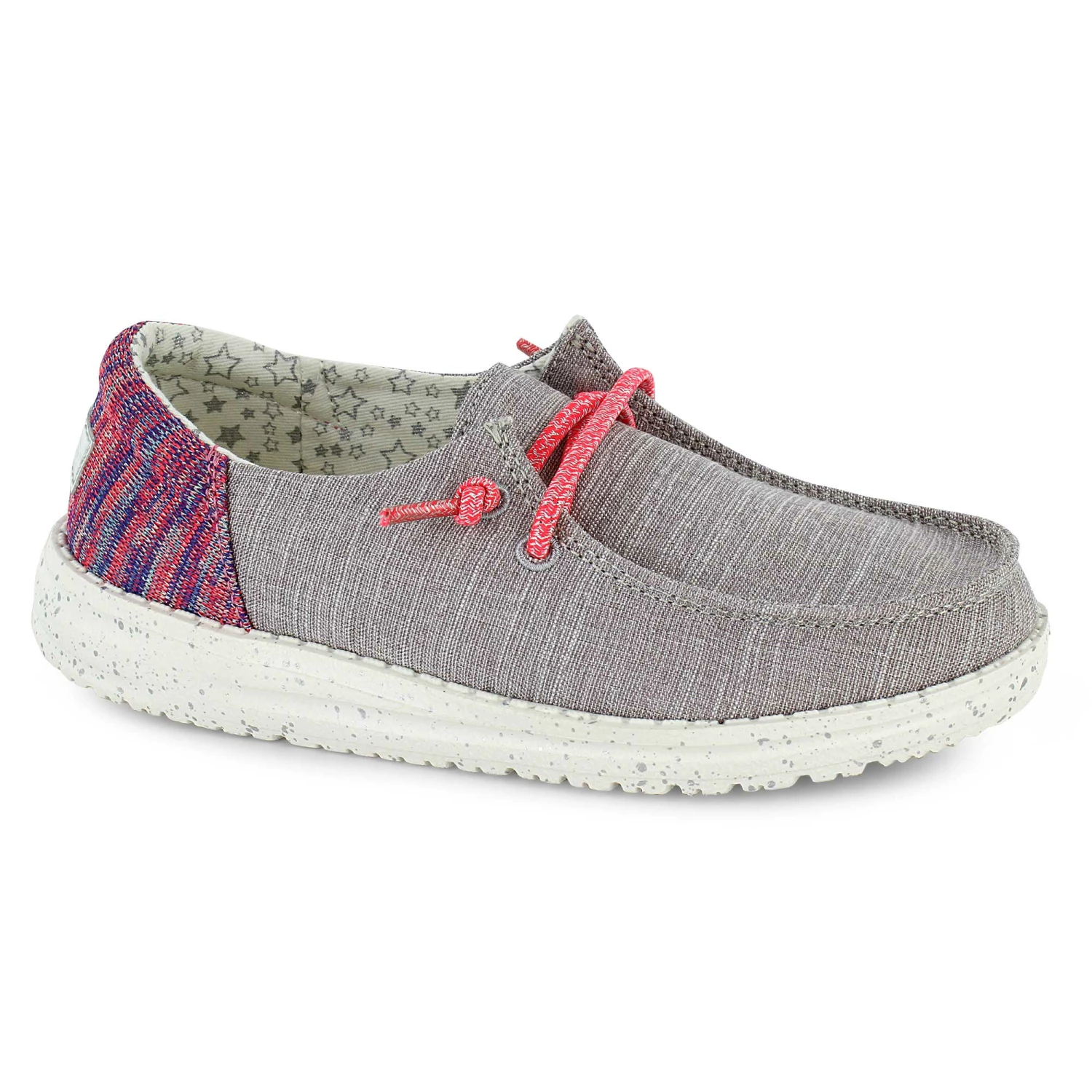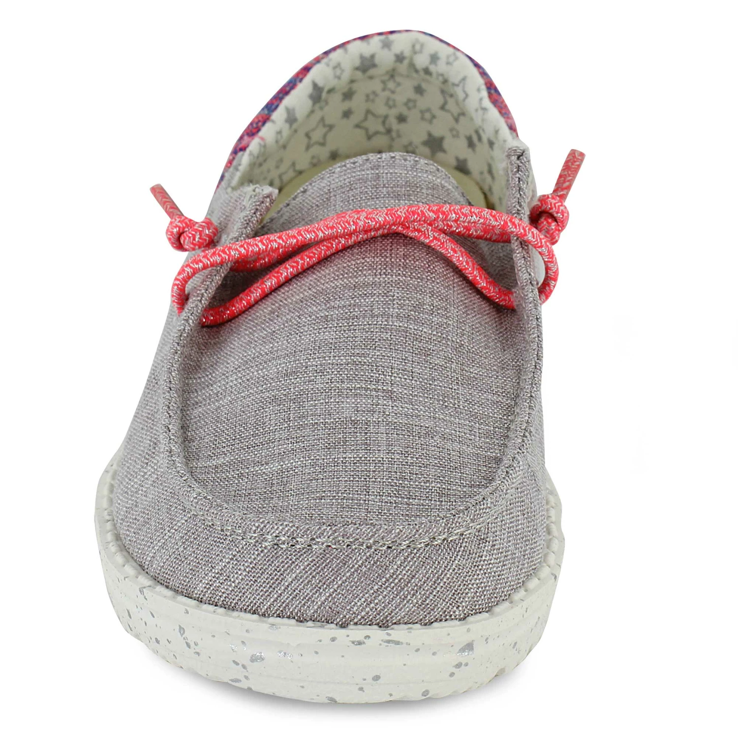 Put a subtle sparkle in your step with cool, casual slip on shoes by Hey Dude. These comfy and lightweight slip-ons are a laid-back way to enjoy fashion without pain. Fans of cotton fabrics will enjoy the breathable upper, and the elastic laces means these shoes stay put, even as your journey carries you further down the road. Available now at SHOE SHOW MEGA.