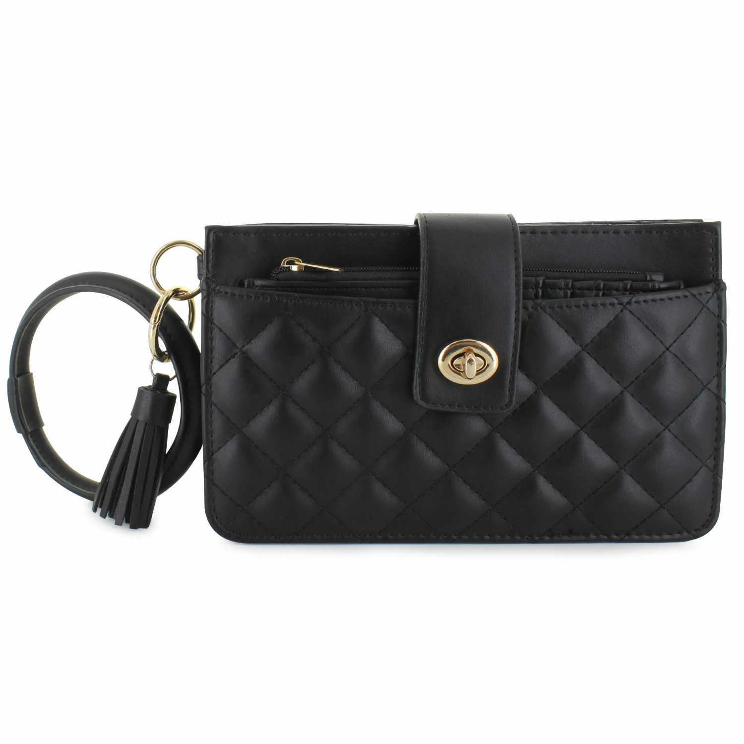 - loop wristlet with 3.5″ opening and a faux-leather tassel accent