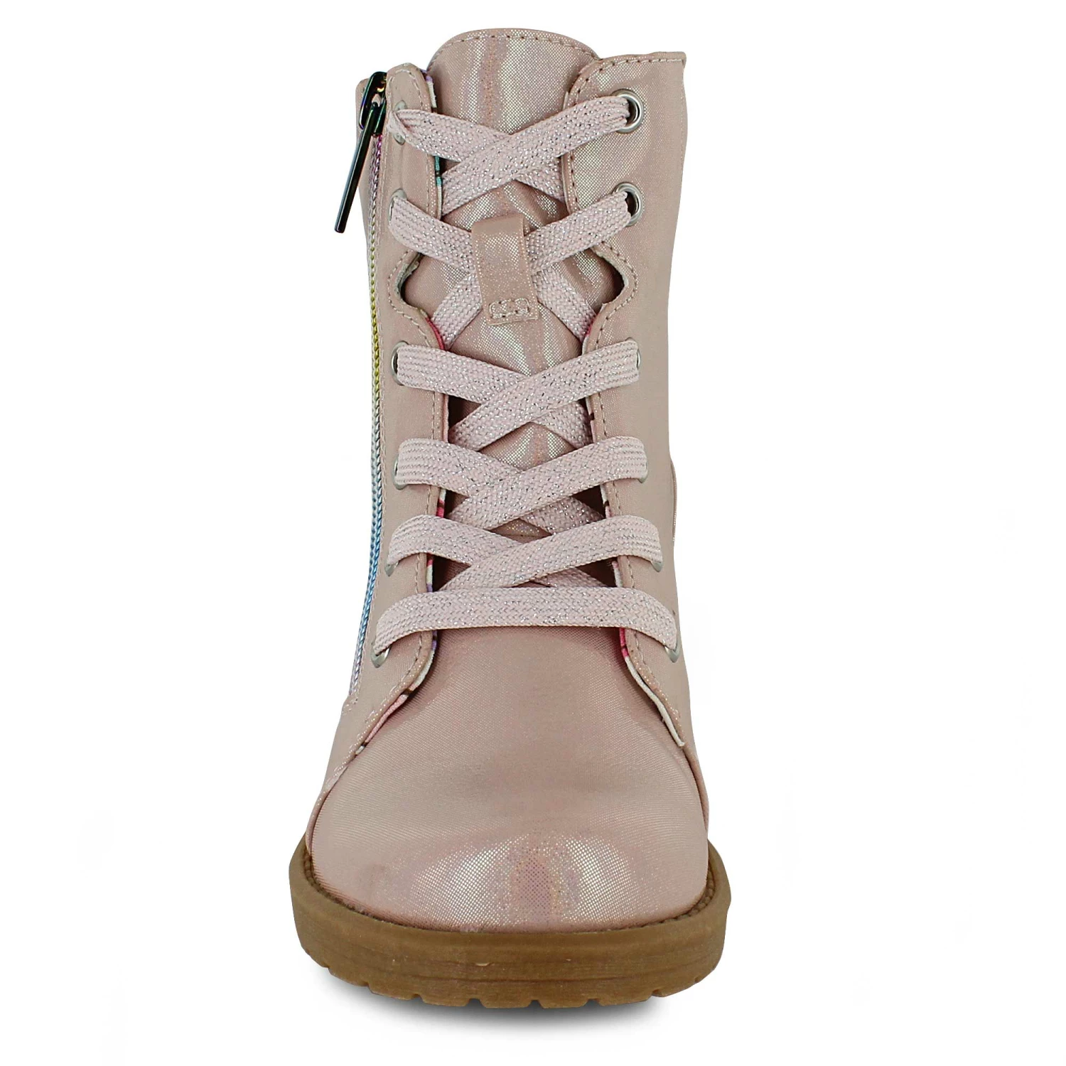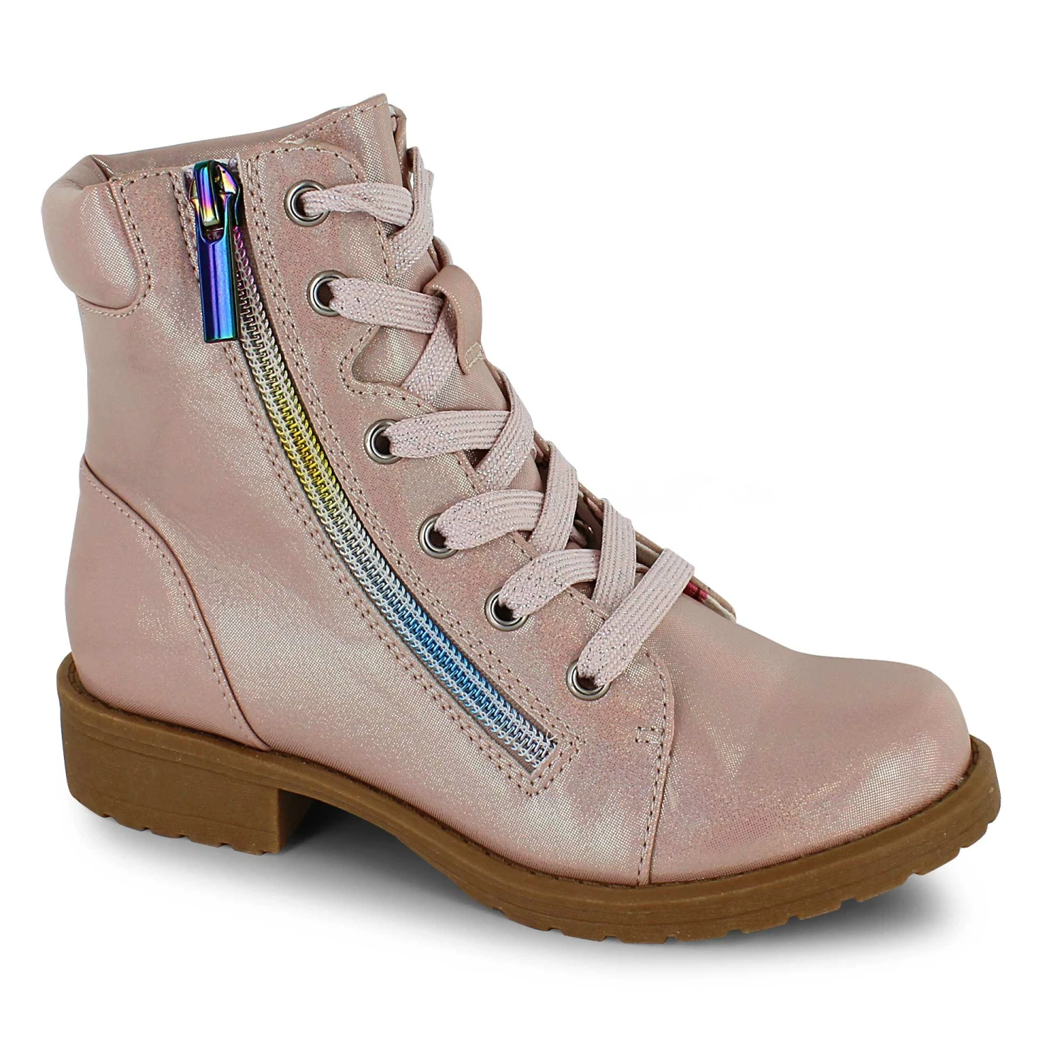 Start off in a flash of color and shine in these trendy Jellypop lace-up boots. A fun rainbow zipper on the side provides easy access so you can be ready to go in no time. Wear them out on weekend adventures with friends and family and show off in glitzy style.