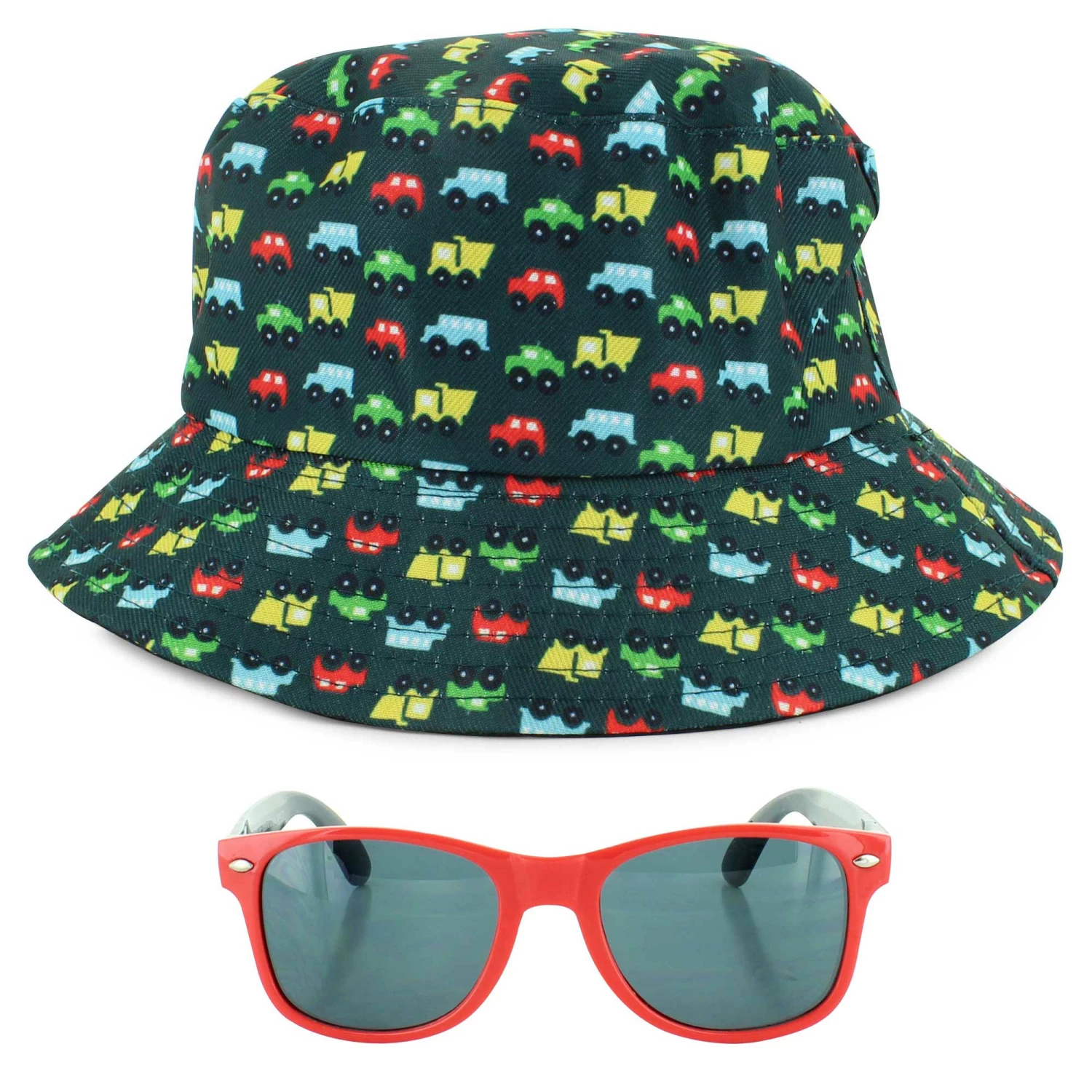 Protect your little one from the sun with this cute little sunglasses and hat set. This combo will have your little one ready to roll with this fun car-print themed design on the hat. The sunglasses are UV 100% Protection rated, so you can enjoy your day, k nowing that you have him covered.