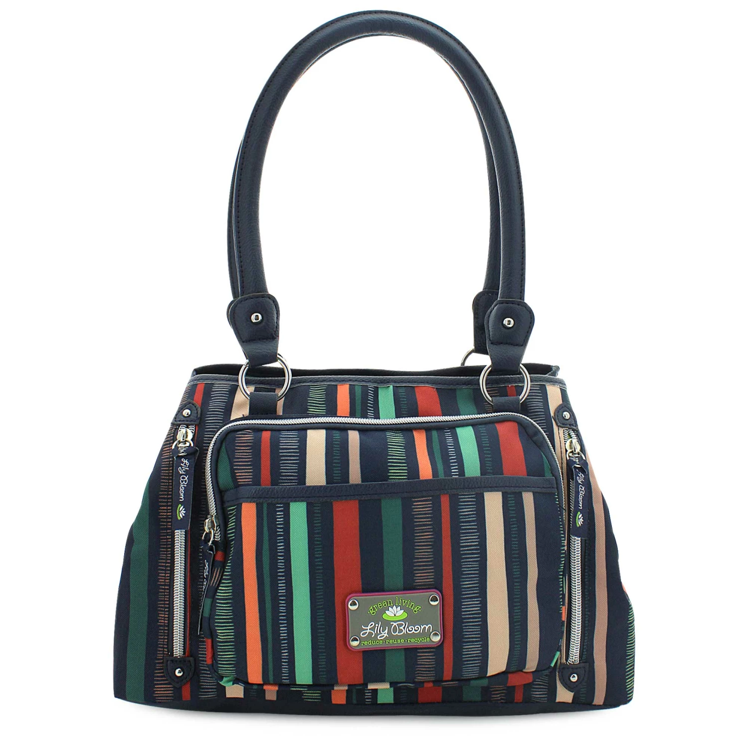 Green Living never looked so good. Check out this cool Dashing Stripe-print satchel by Lily Bloom that is made from recycled plastic bottles. Their signature KARMA BLOOM fabric helps complete the cycle of reduce, reuse and recycle. Shop SHOE SHOW MEGA today.