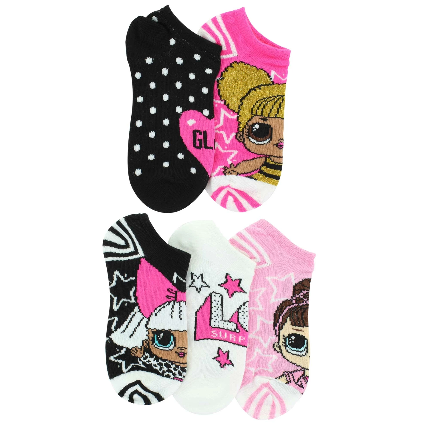Your little one will be kicking up their heels when you choose this 5-pair pack of socks with their favorite L.O.L. Surprise! characters on them. These no-show socks include an assortment of colors so they can pair them up to match or have some mis-match fun and add some craziness to their day. This multipack will put a smile on their face and also on yours.