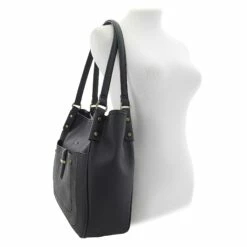 - fabric lined interior that features two open compartments separated by a zippered compartment and side zip and slip pockets