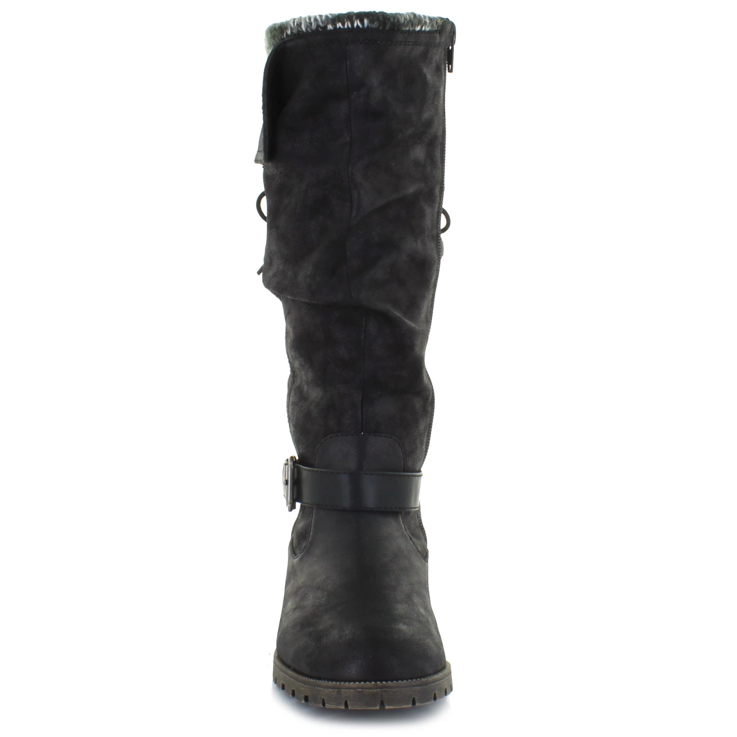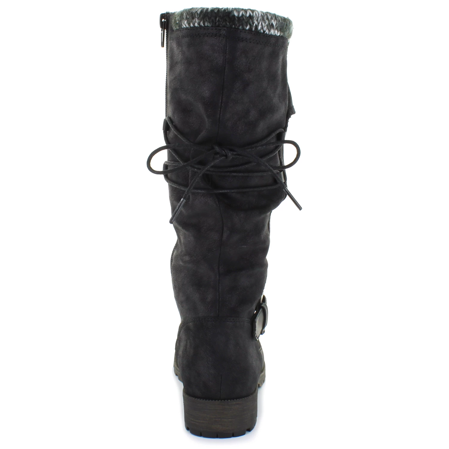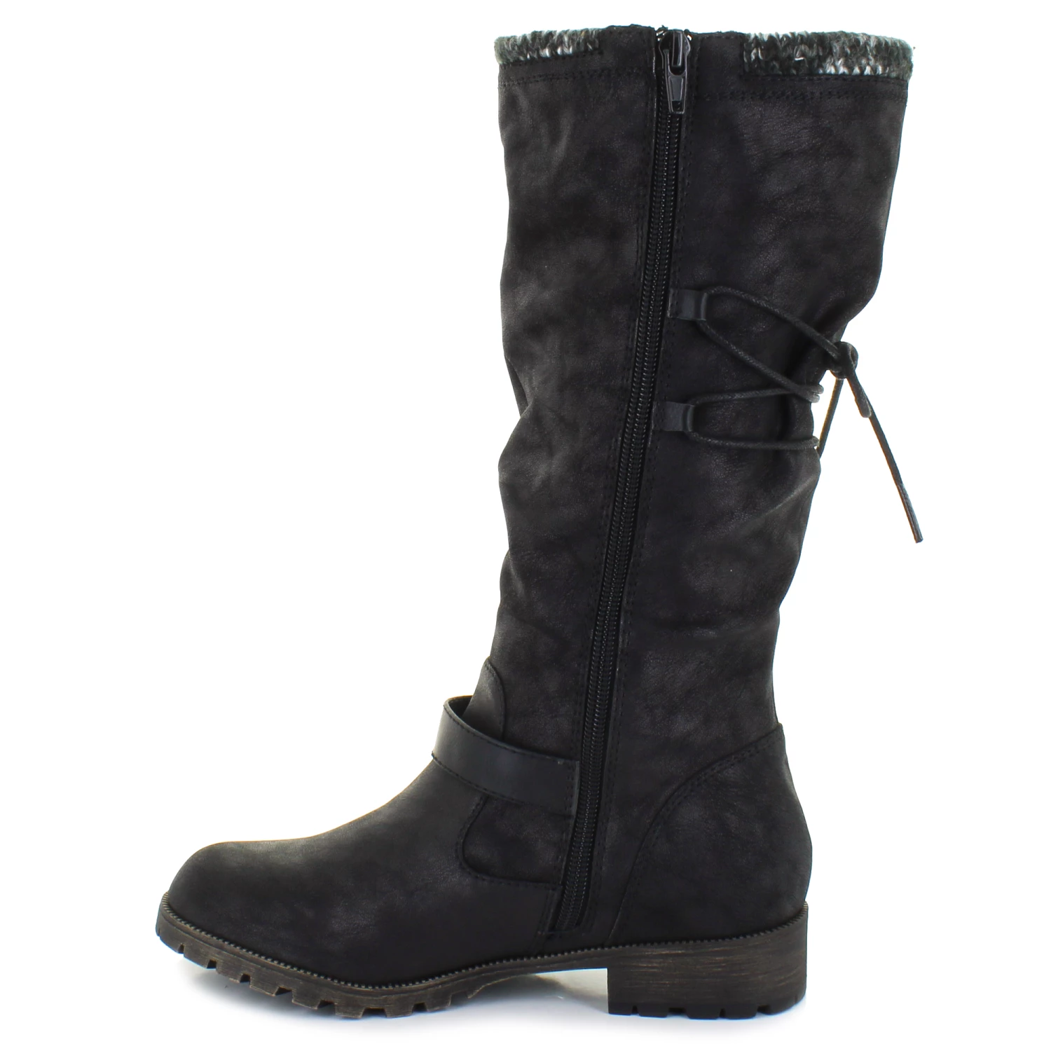 Stay warm and cozy this winter in the Shimmer by EDL Kaelyn boot. This style features a buckle and strap detail with a back lace. The sweater knit inside lining will provide warmth and comfort.