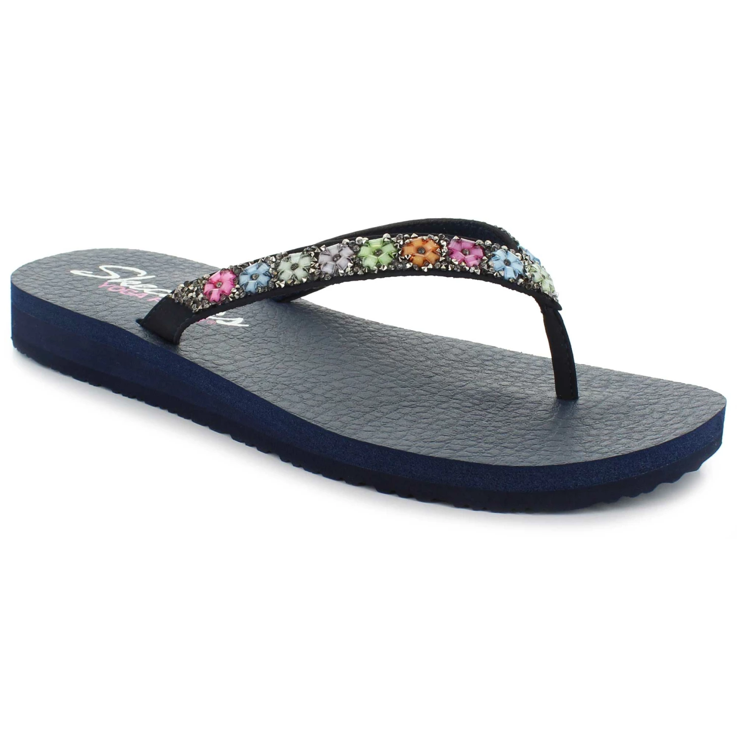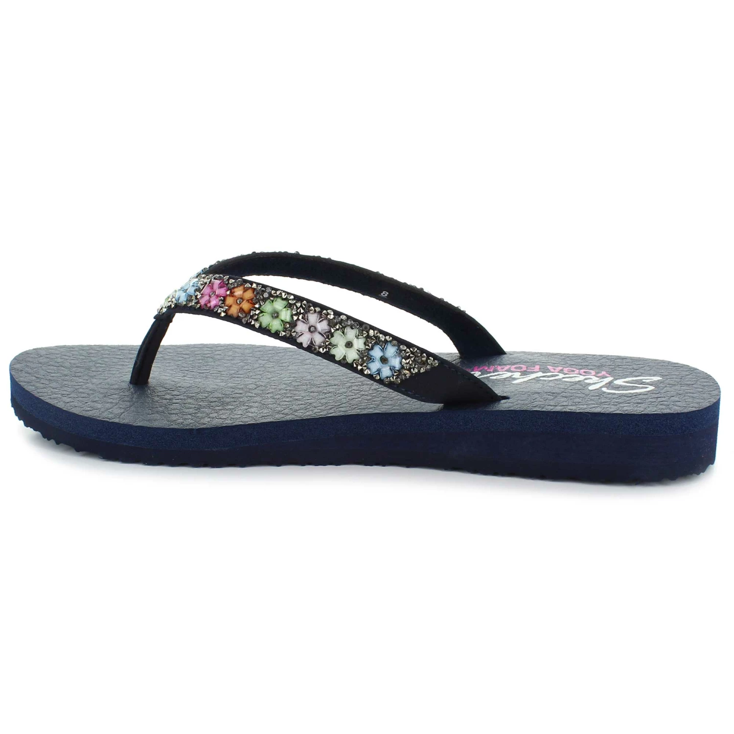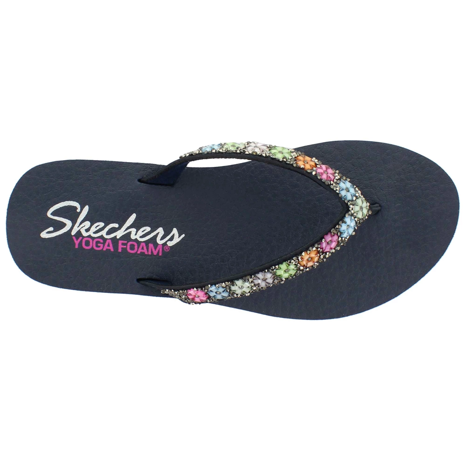 Warm weather style is in full flower with the SKECHERS Cali Meditation – Daisy Delight sandal. Smooth synthetic upper in a casual comfort thong sandal design with colorful gem daisy detail and YOGA FOAM footbed.