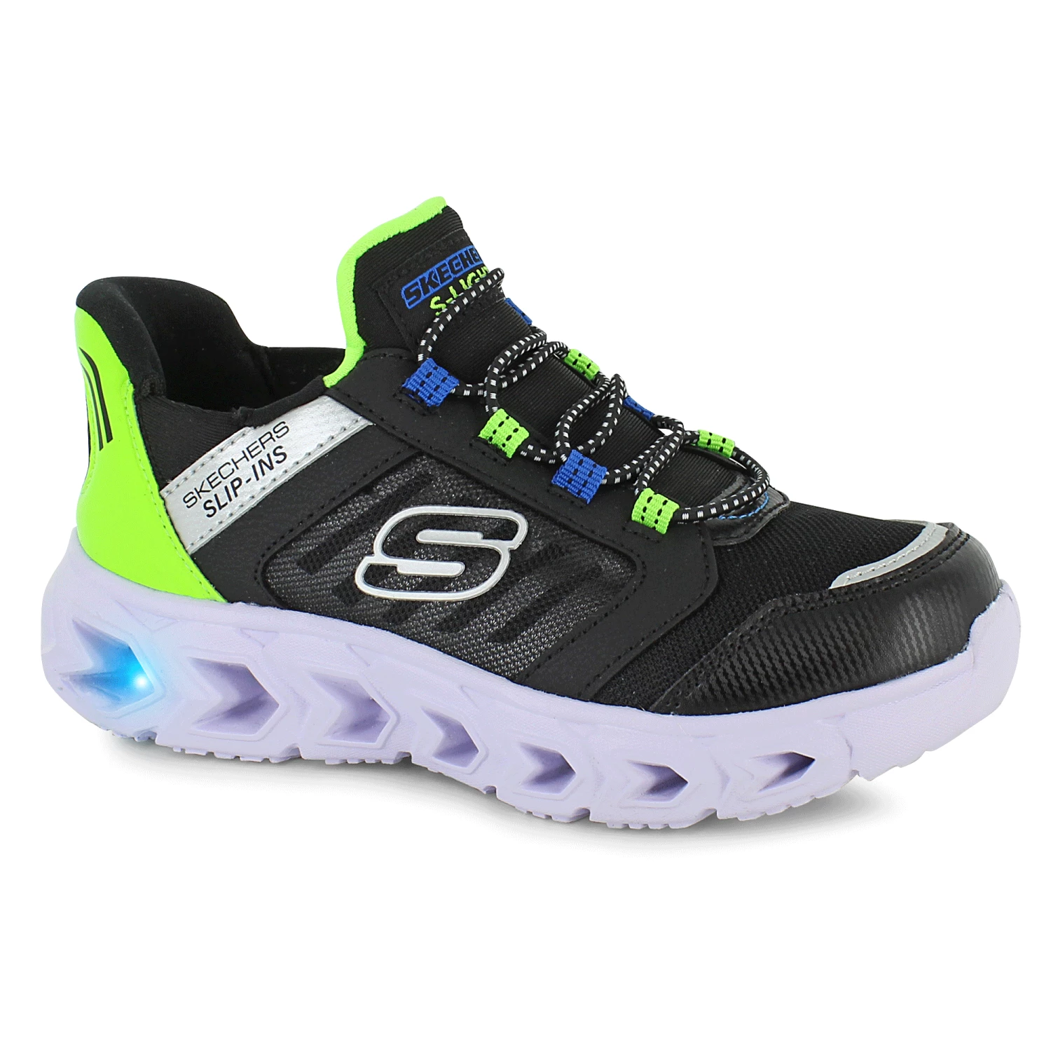 Be ready for fun in record time, with playful Skechers Slip-in sneakers. These shoes feature an easy-access opening and elastic stretch, providing a perfect slip-on fit with no bending required. Flashing lights flicker with every step and leap you make.
