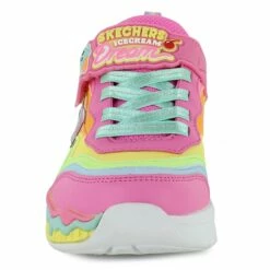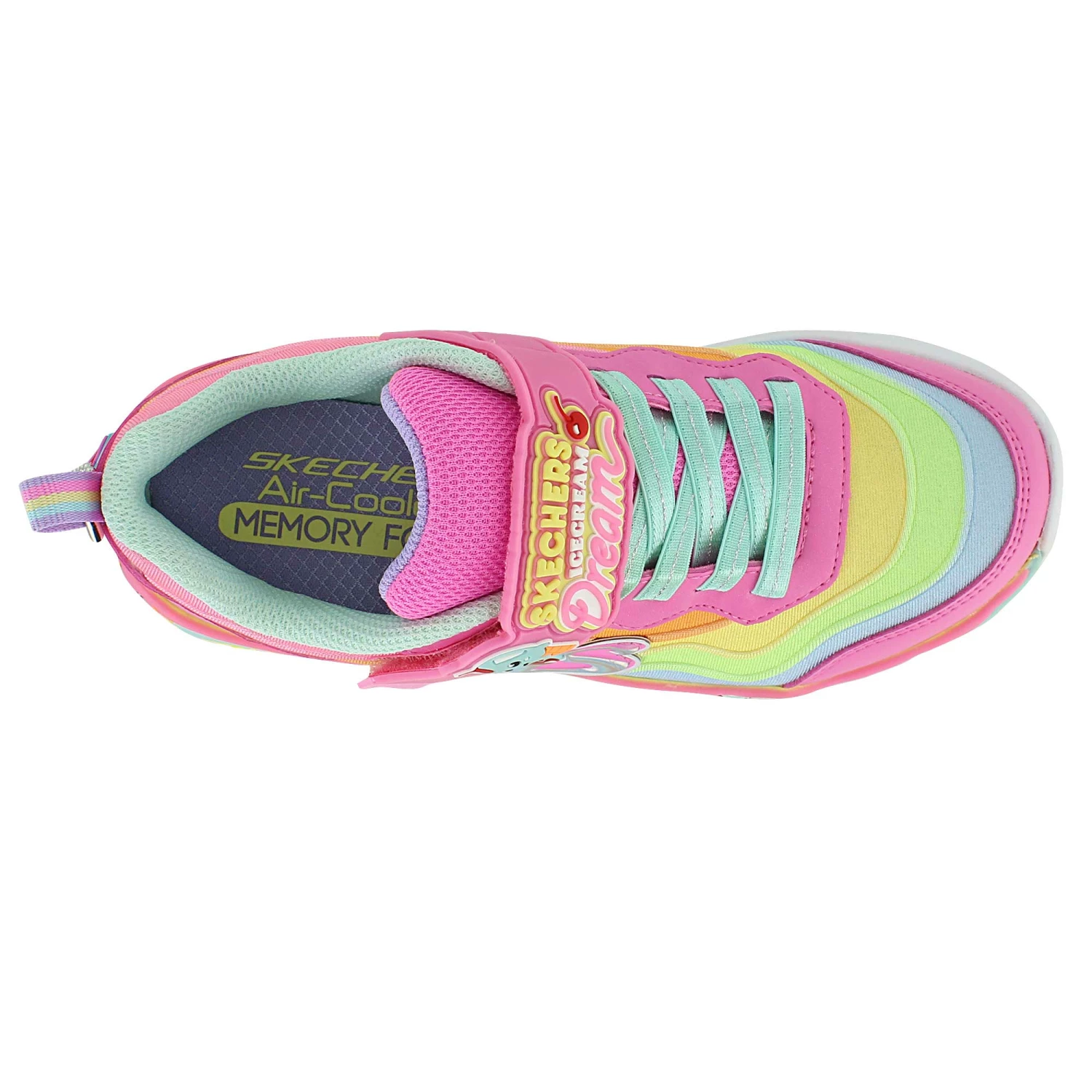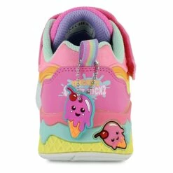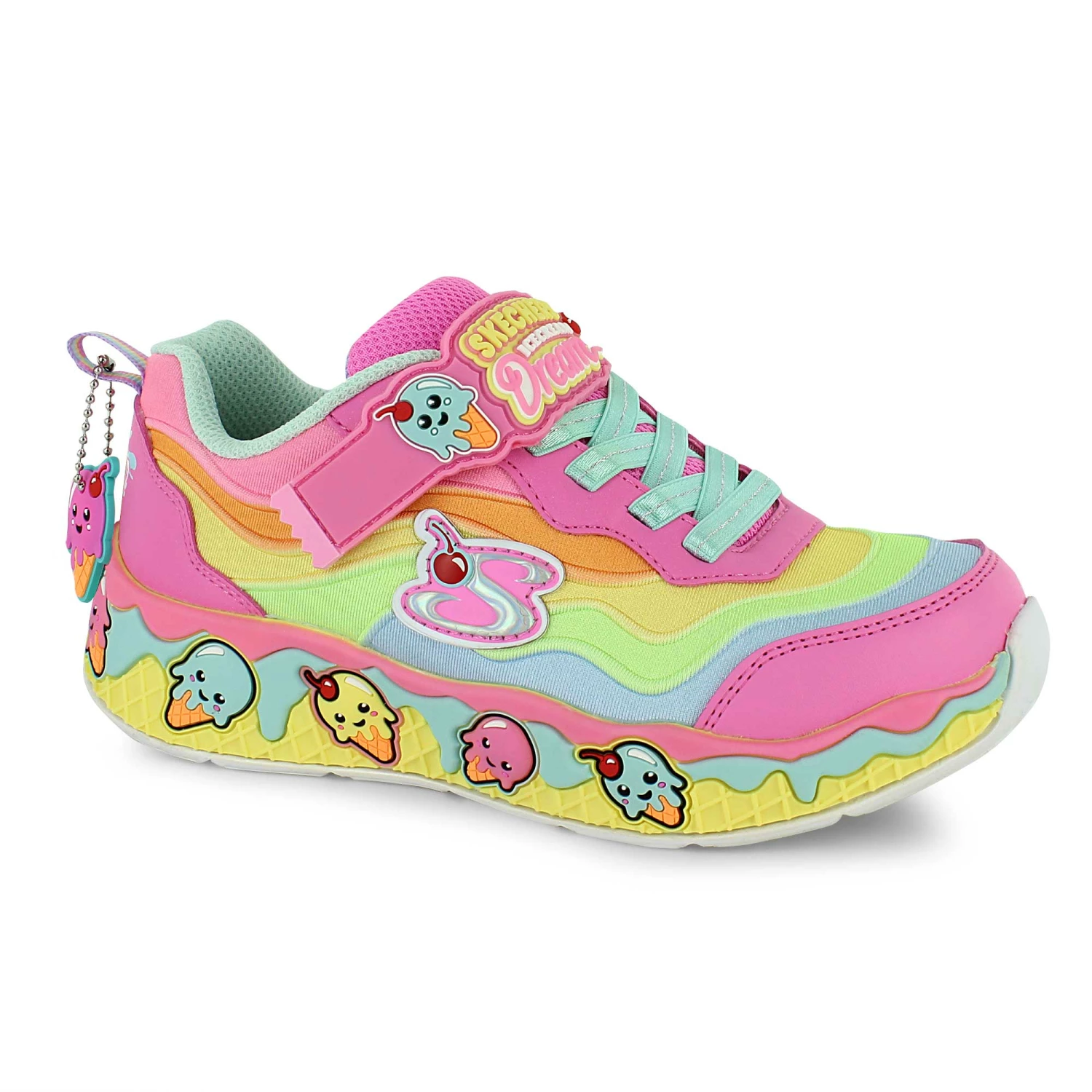 Stand out with bold style in these fun scented Skechers sneakers. A cute ice cream theme is paired with sweet smelling graphics on the strap. Stretchy laces, a strap closure and lightweight construction make these an overall perfect shoe for any playtime adventure.