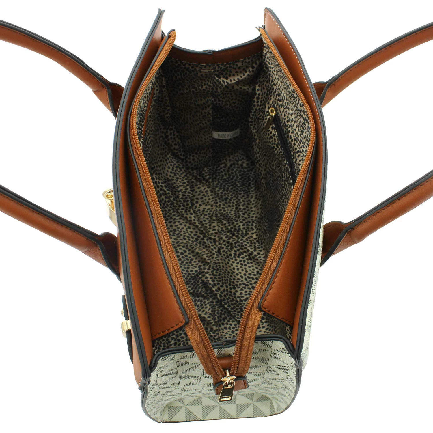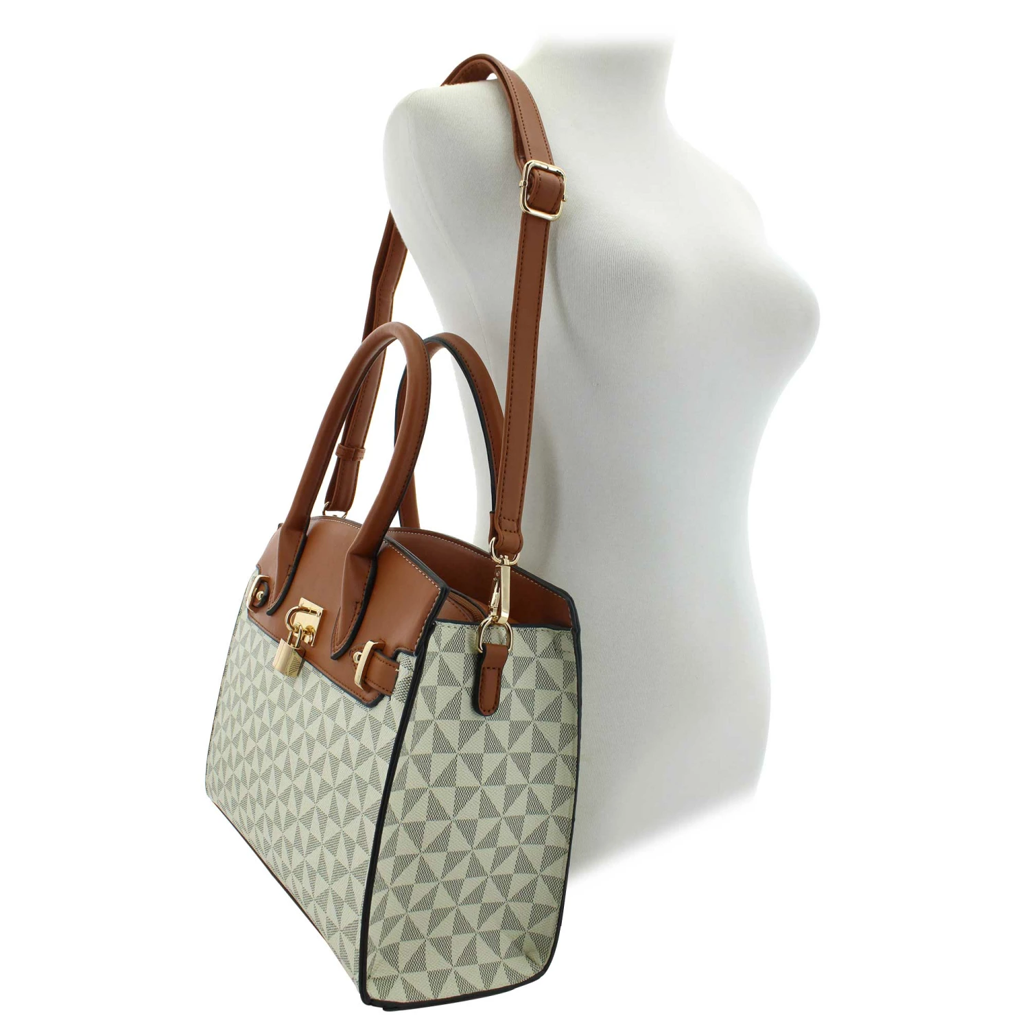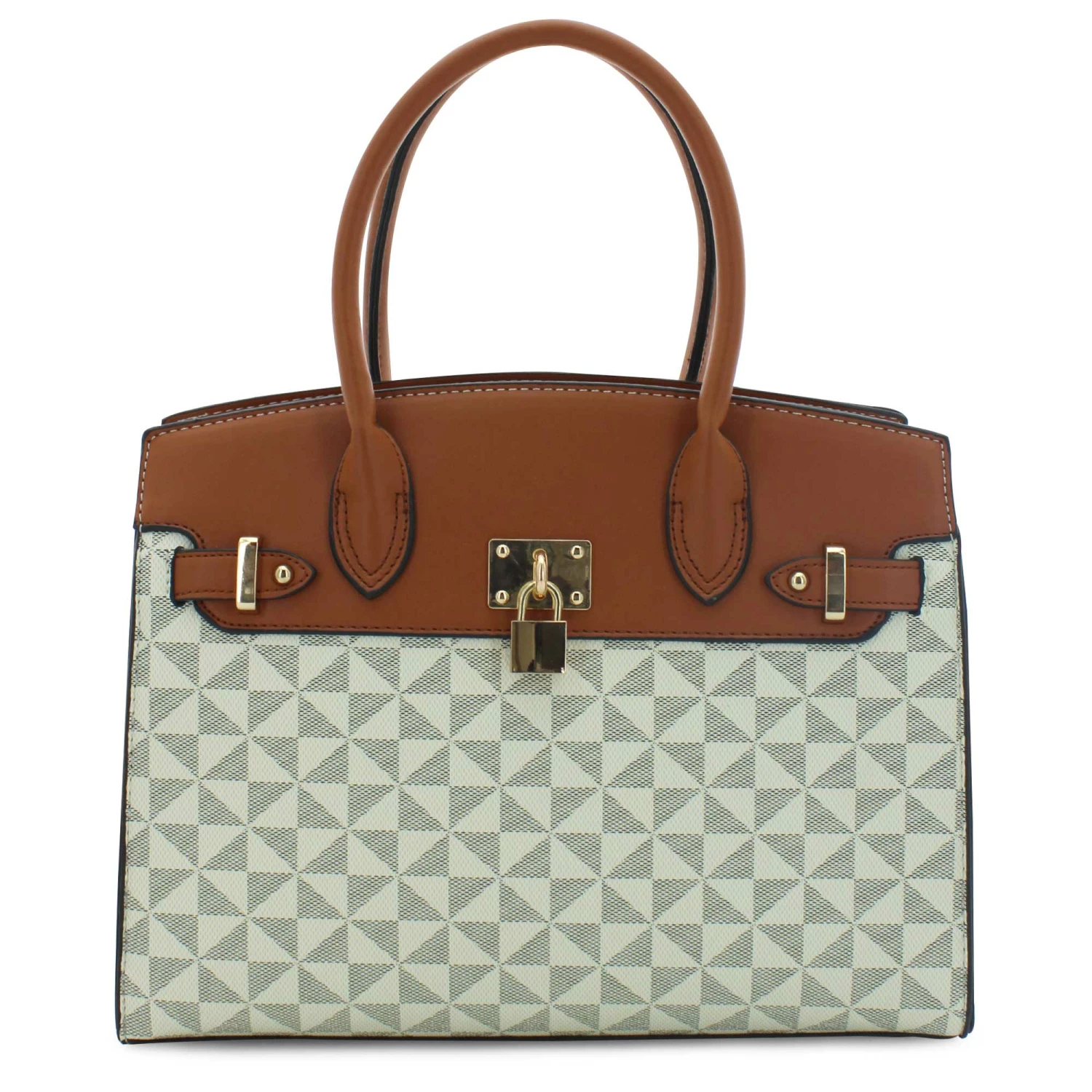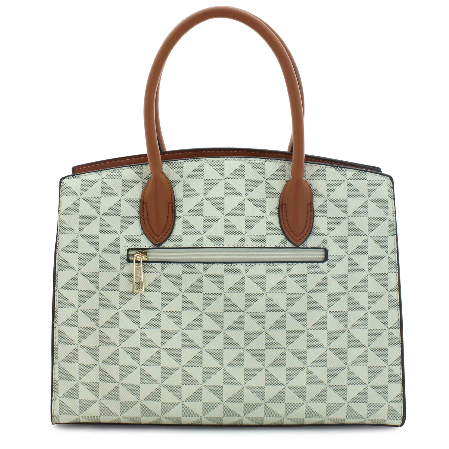 This fashionable geometric-print satchel by Tami Too is a classic design that will pair well with multiple outfits for work or a casual day out. It can be carried with the double rolled handles or over your shoulder with the included removable shoulder strap. Keep your personal effects close at hand in style. Shop SHOE SHOW MEGA today.