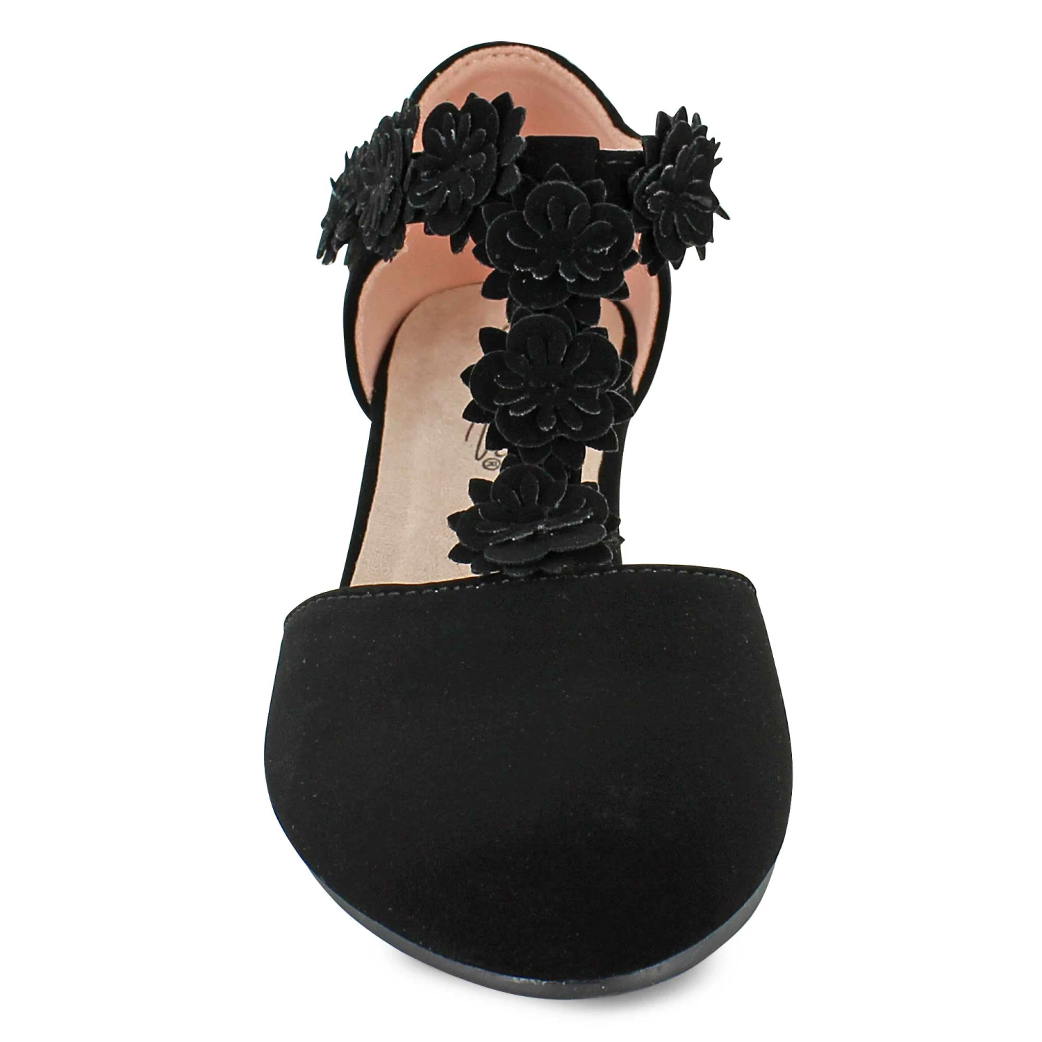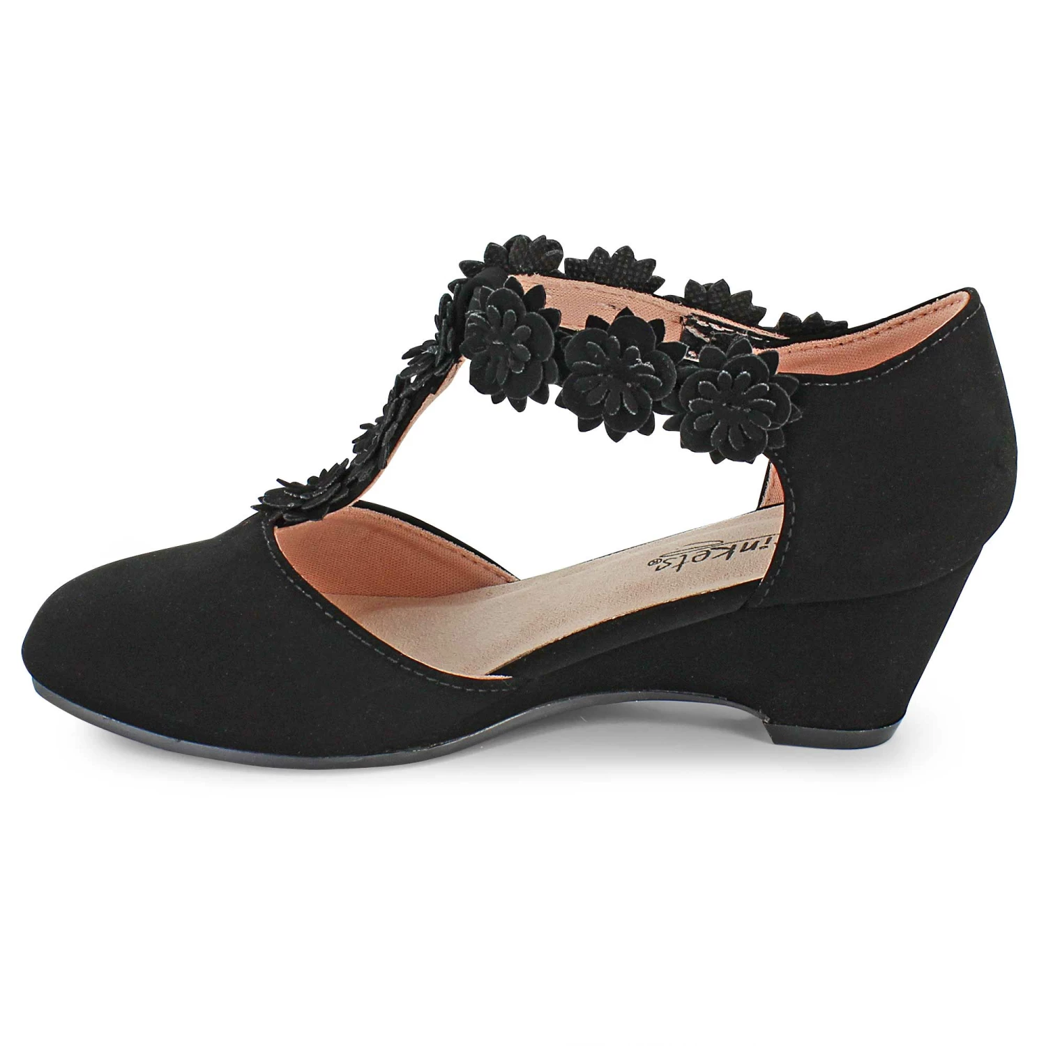Look picture-perfect in these pretty dress shoes by Trinkets. Decorative flower accents add a cute whimsical touch without overwhelming your wardrobe. A low wedge heel and convenient strap closure add extra security and stability as you move.