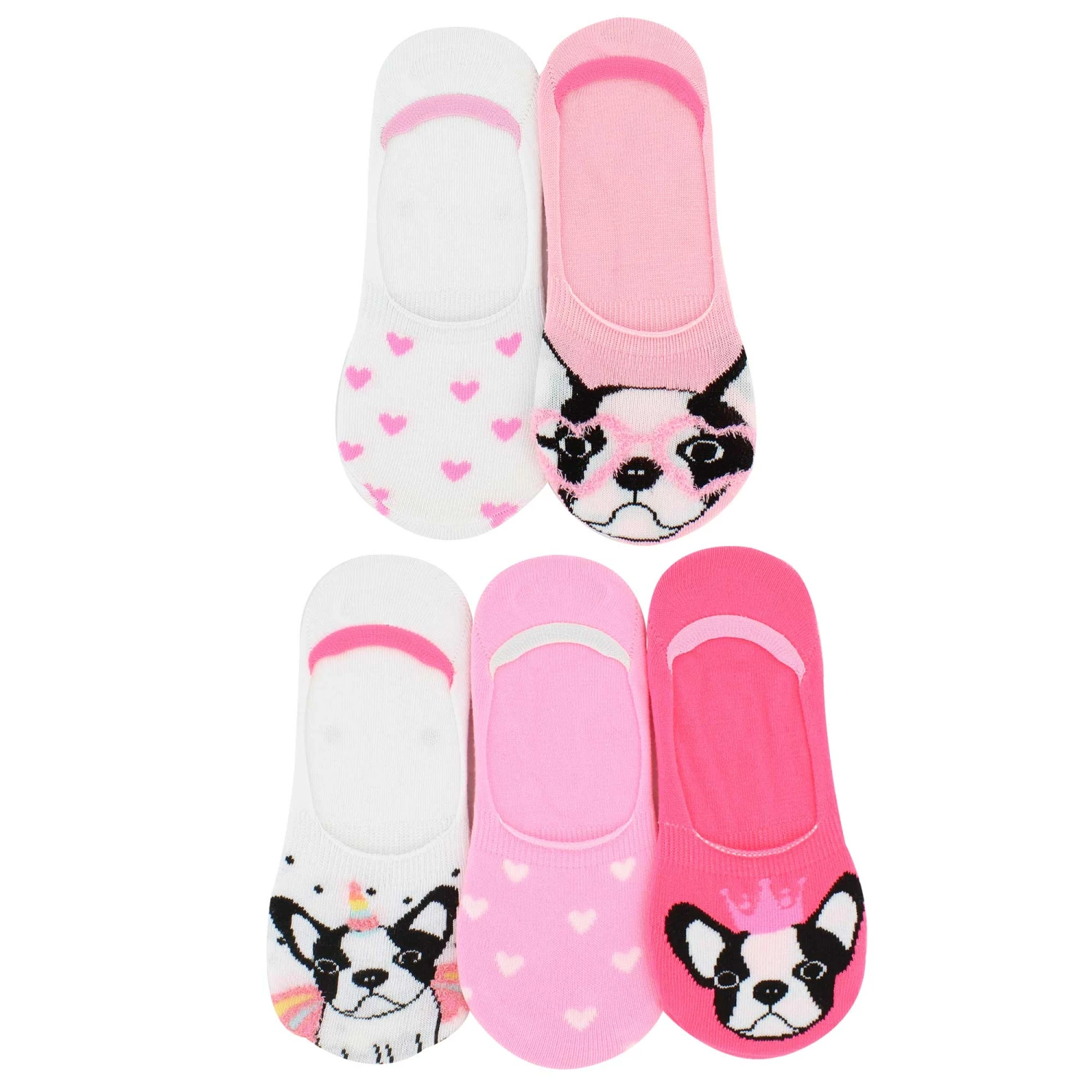 - 3 French Bulldog designs and 2 heart-patterned socks